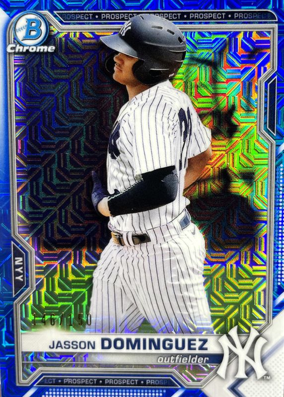 Best Prices Available For Sale of Jasson Dominguez 2021 Bowman Mega Box #BCP-13 Chrome Prospects - Blue Mojo Refractor /150