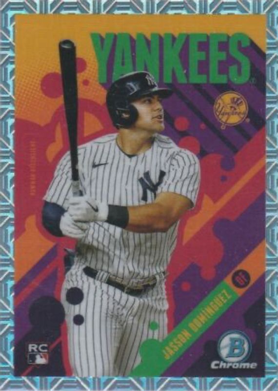 This card is 1 of 27 Jasson Dominguez's card variations in the 2024 Bowman Chrome Mega Box set being tracked by Sports Card Investor, including Base, Aqua Mojo Refractor /299, Purple Mojo Refractor /250, Pink Mojo Refractor /199, and Blue Mojo Refractor /150.