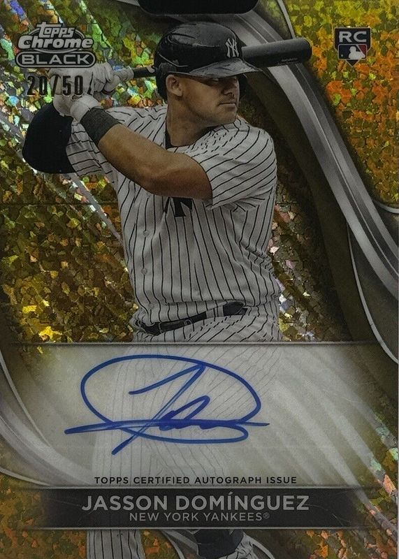 The Jasson Dominguez 2024 Topps Chrome Black #CBA-JDO Autographs - Gold Mini-Diamond Refractor /50 Rookie card in Raw condition has not changed in price in the last 30 days and was last sold for $87.77 .