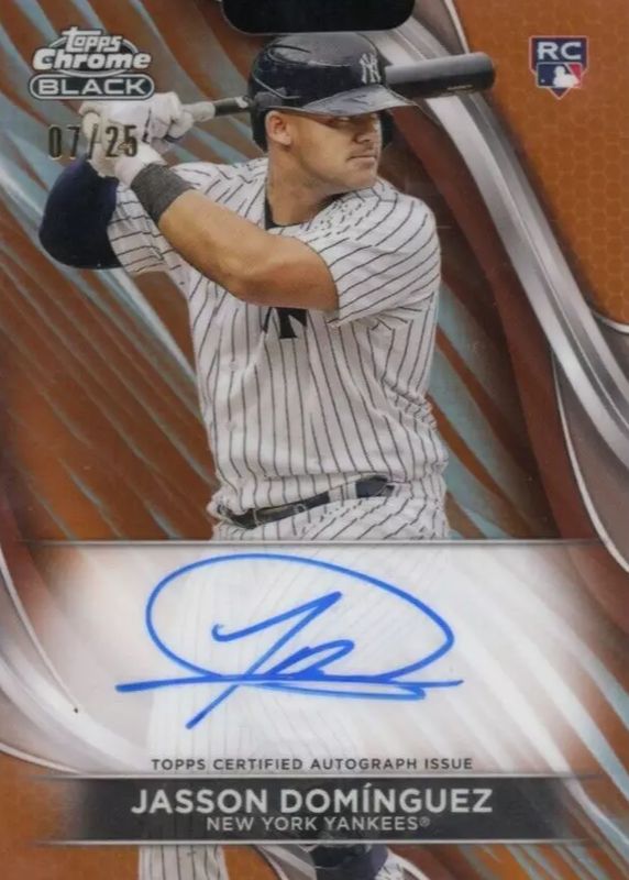The Jasson Dominguez 2024 Topps Chrome Black #CBA-JDO Autographs - Orange Refractor /25 Rookie card in Raw condition has not changed in price in the last 30 days and was last sold for $129.99 .