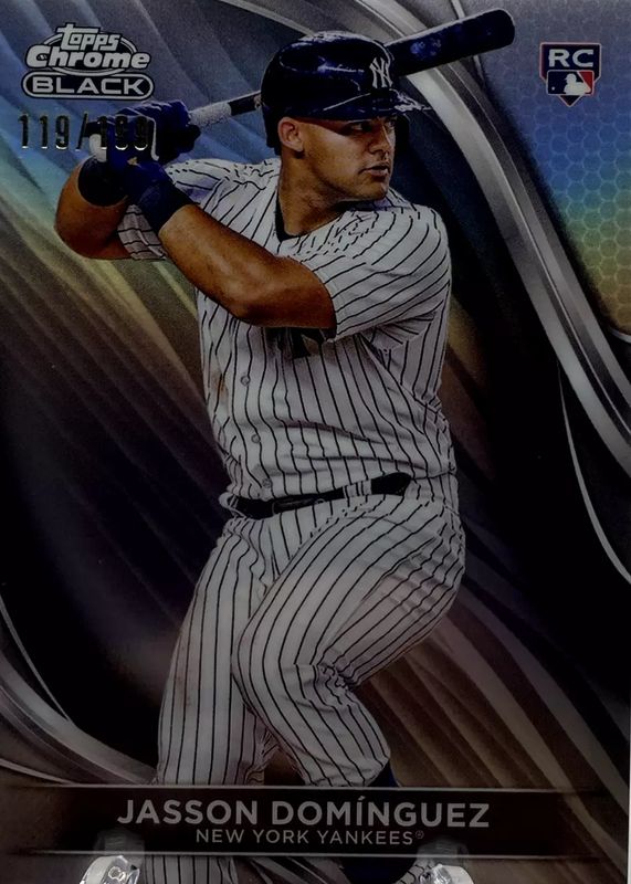 This card is 1 of 28 Jasson Dominguez's card variations in the 2024 Topps Chrome Black set being tracked by Sports Card Investor, including Base, Rookie Variation, Purple Mini-Diamond Refractor /150, Green Refractor /99, and Green Wave Refractor /99.