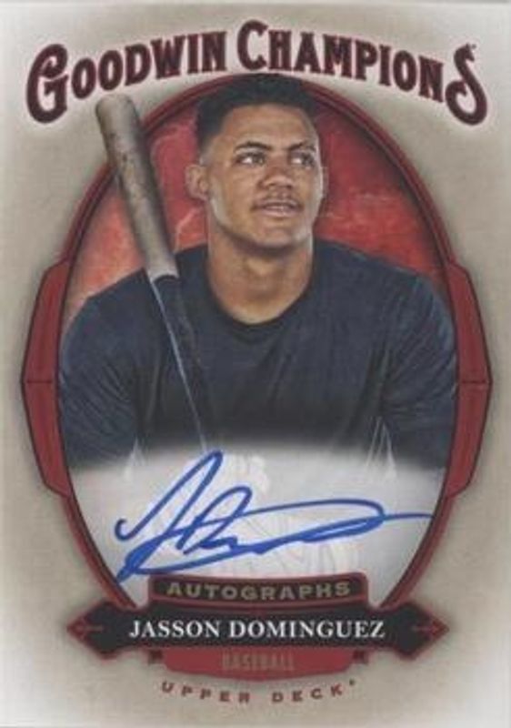 The Jasson Dominguez 2020 Upper Deck Goodwin Champions #A-JD Autographs card is 1 of 69 Jasson Dominguez's card variations in the 2020 Upper Deck Goodwin Champions set being tracked by Sports Card Investor, including #95 Base, #45 Base, #145 Base, #45 3 D Lenticular, and #45 Black & White.