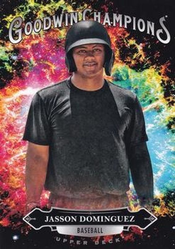 The Jasson Dominguez 2020 Upper Deck Goodwin Champions #145 Base card is 1 of 69 Jasson Dominguez's card variations in the 2020 Upper Deck Goodwin Champions set being tracked by Sports Card Investor, including #95 Base, #45 Base, #45 3 D Lenticular, #45 Black & White, and Blank Back.