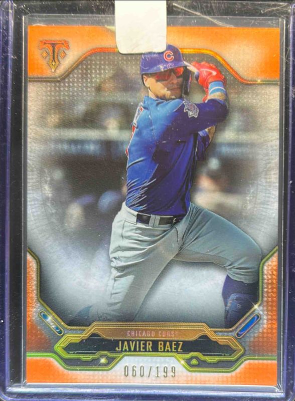 The Javier Baez 2020 Topps Triple Threads #20 Amber /199 card is 1 of 53 Javier Baez's card variations in the 2020 Topps Triple Threads set being tracked by Sports Card Investor, including Base, Amethyst /299, Emerald /259, Gold /99, and Citrine /75.