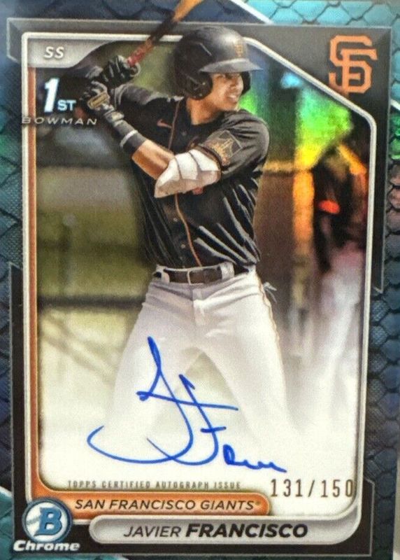 This card is 1 of 25 Javier Francisco's card variations in the 2024 Bowman Chrome set being tracked by Sports Card Investor, including Prospect Auto (1st), Prospect Auto - Refractor /499 (1st), Prospect Auto - Speckle Refractor /299 (1st), Prospect Auto - Purple Refractor /250 (1st), and Prospect Auto - Blue RayWave Refractor /150 (1st).