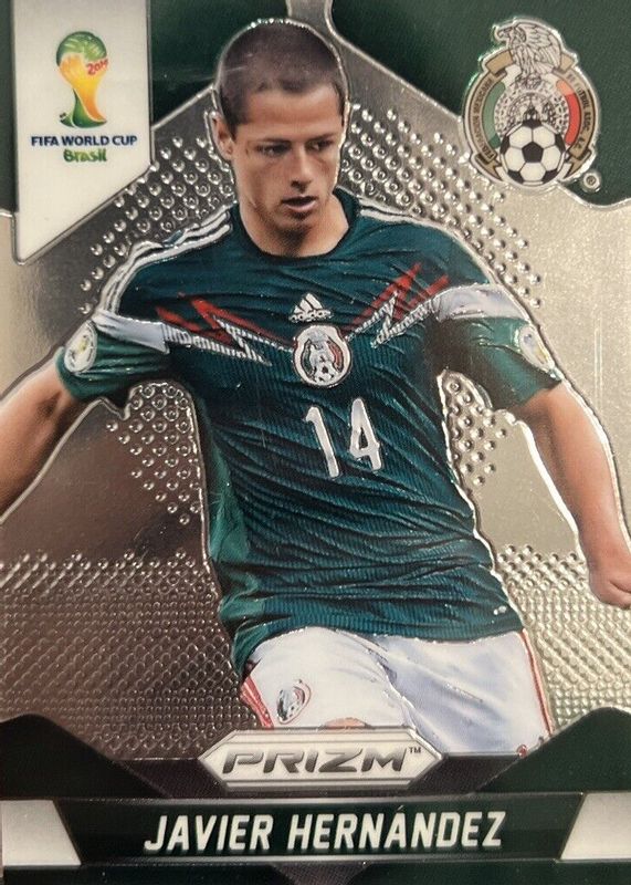 This card is 1 of 12 Javier Hernandez's card variations in the 2014 Prizm World Cup set being tracked by Sports Card Investor, including Blue & Red Wave, Red White Blue Power Plaid, Silver, Yellow & Red Pulsar, and Blue /199.