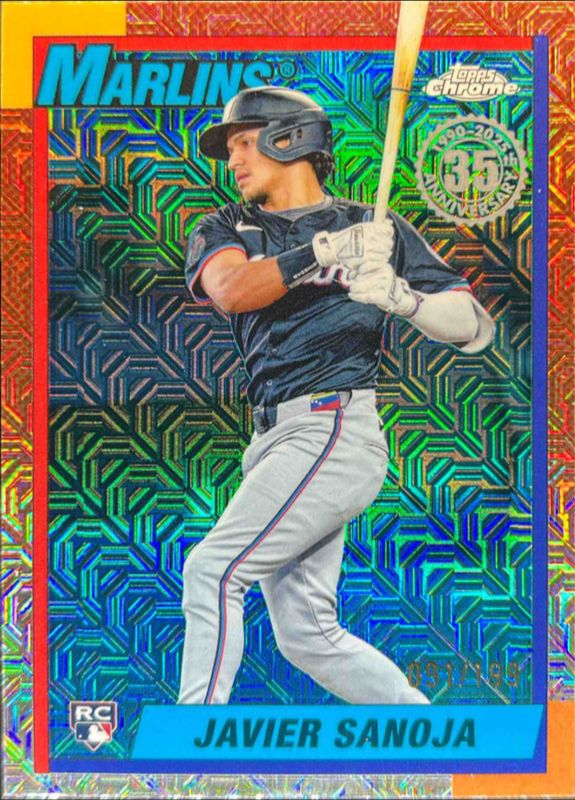 The Javier Sanoja 2025 Topps #T90C-124 1990 Baseball Chrome Silver Pack - Aqua Refractor /199 Rookie card is 1 of 104 Javier Sanoja's card variations in the 2025 Topps set being tracked by Sports Card Investor, including Base, Aqua Holo Foil, Diamante Foil, Holo Foil, and Pink Diamante Foil.