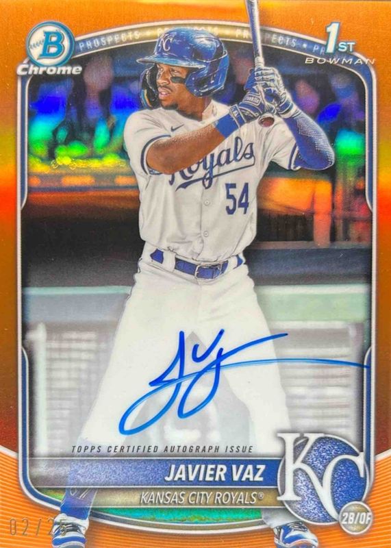 2025 Bowman Javier Vaz Chrome Auto Orange Refractor 1st #/25 Royals