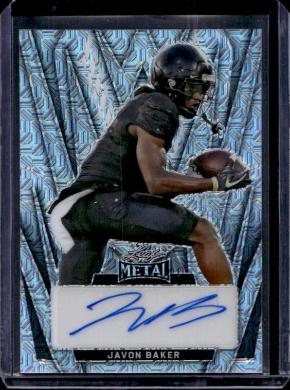 The Javon Baker 2024 Leaf Metal #BA-JB1 Autographs - Mojo Silver /9 Rookie card is 1 of 220 Javon Baker's card variations in the 2024 Leaf Metal set being tracked by Sports Card Investor, including Autographs Pulsar Sky Pre Production Proofs, Prismatic Silver, Mojo Silver /10, Pulsar Silver /10, and Crystal Silver /8.