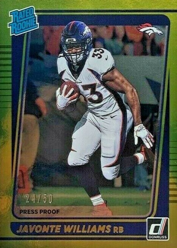 2021 Panini Donruss Javonte Williams RC, Gold RATED ROOKIE, Press Proof, #48/50