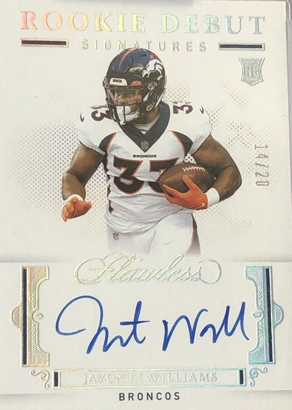 The Javonte Williams 2021 Flawless #RDS-JWI Rookie Debut Signatures - Silver (/20) card in Raw condition has not changed in price in the last 30 days and was last sold for $99.99 .