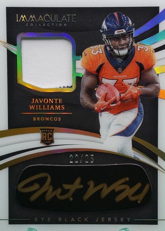 The Javonte Williams 2021 Immaculate #REB-JWI Immaculate Rookie Eye Black Jersey Autographs - Gold (/25) card in Raw condition has not changed in price in the last 30 days and was last sold for $37.01 .