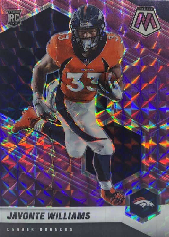 This card is 1 of 47 Javonte Williams' card variations in the 2021 Mosaic set being tracked by Sports Card Investor, including Base, Choice Red & Green, Green, No Huddle, and Pink Camo.