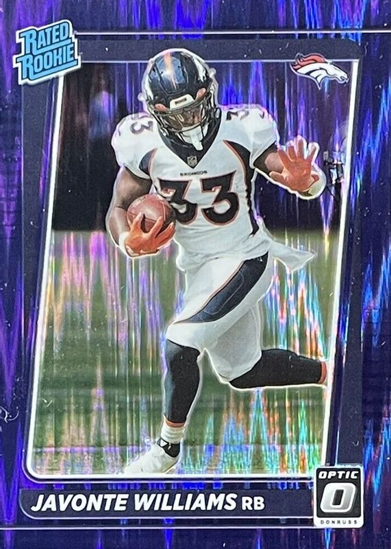 The Javonte Williams 2021 Optic #215 Purple Shock Rookie card in Raw condition has moved down -$0.70 (-41.4%) in the last 30 days and was last sold for $0.99 .