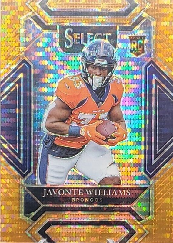 The Javonte Williams 2021 Select #257 Club Level Neon Orange Pulsar /7 Rookie card in Raw condition has not changed in price in the last 30 days and was last sold for $41.00 .