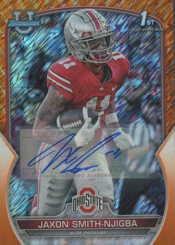 Auctions Ending Soon for Jaxon Smith-Njigba 2022 Bowman Chrome University #78 Prospect Auto - Orange Shimmer Refractor /25 (1st) RAW