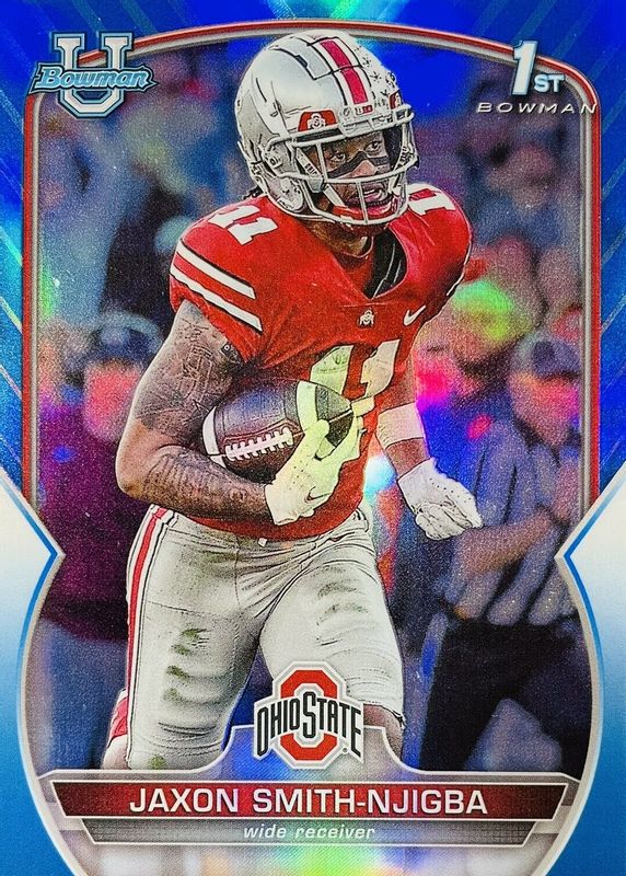 This card is 1 of 53 Jaxon Smith-Njigba's card variations in the 2022 Bowman Chrome University set being tracked by Sports Card Investor, including Prospects (1st), Prospects - Pink Refractor (1st), Prospects - Purple Shimmer Refractor (1st), Prospects - Refractor (1st), and Prospects - SP Variation (Pointing).