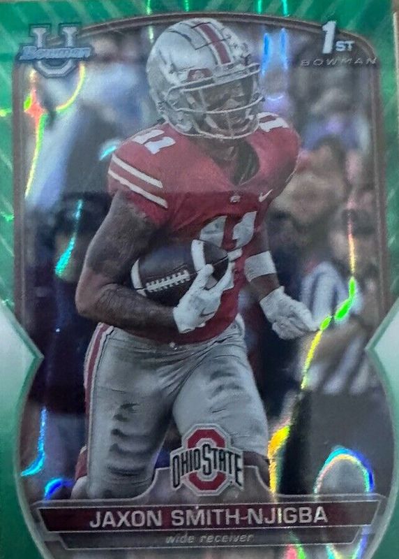 The Jaxon Smith-Njigba 2022 Bowman Chrome University #78 Prospects - Green Shimmer Refractor /99 (1st) card in Raw condition has not changed in price in the last 30 days and was last sold for $23.24 .