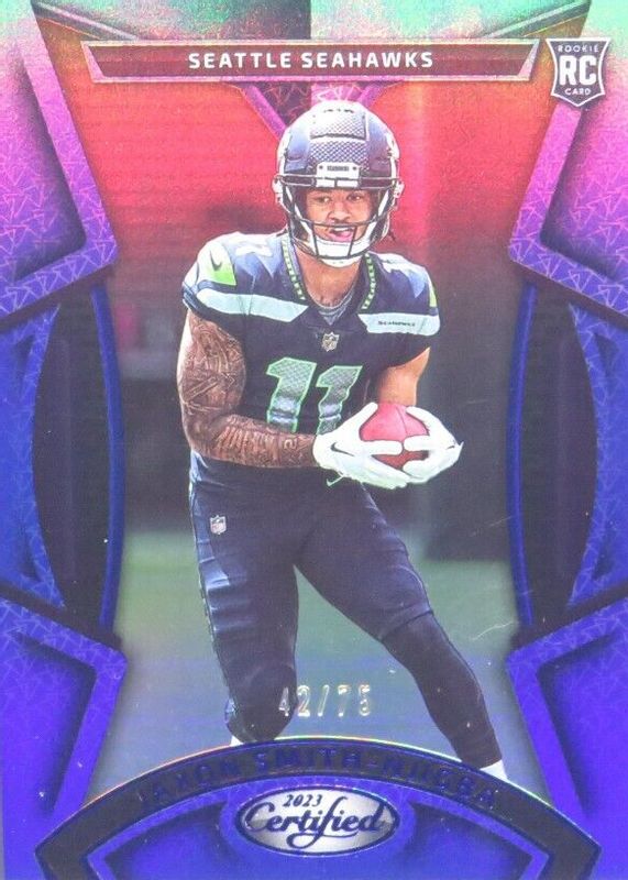 This card is 1 of 20 Jaxon Smith-Njigba's card variations in the 2023 Certified set being tracked by Sports Card Investor, including Base Rookie /399, Mirror /325, Mirror Bronze /275, Mirror Pink /199, and Mirror Orange /149.