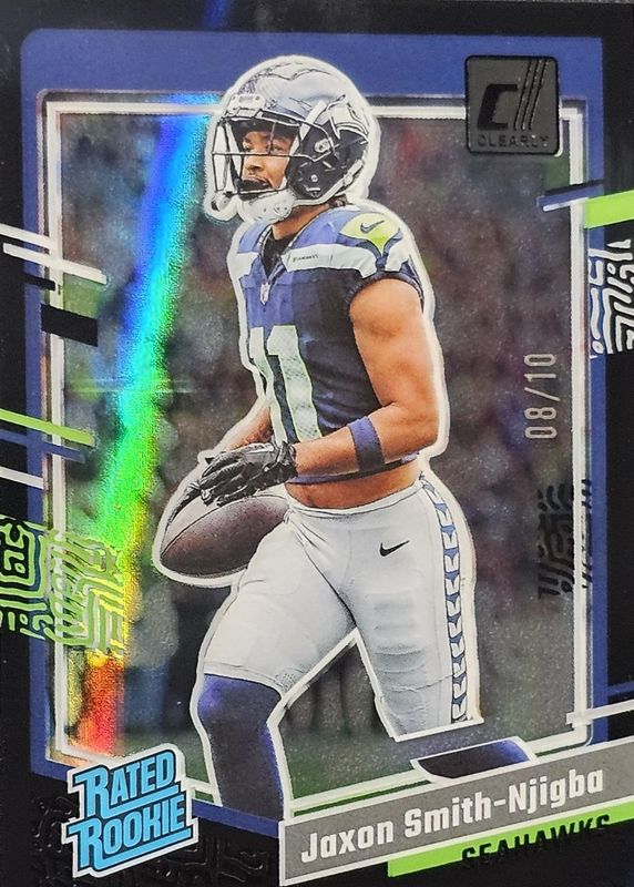 This card is 1 of 21 Jaxon Smith-Njigba's card variations in the 2023 Clearly Donruss set being tracked by Sports Card Investor, including Base, Gold, Holo Mosaic, Holo Rated Rookie Logo, and Purple /199.