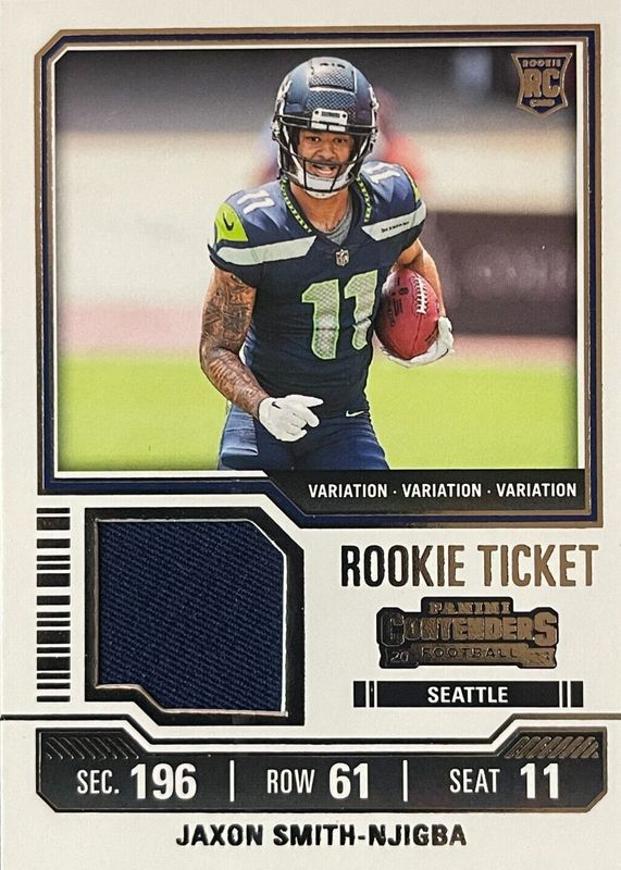 The Jaxon Smith-Njigba 2023 Contenders #TS17V Rookie Ticket Swatches Variation card in Raw condition has moved up $0.25 (+12.5%) in the last 30 days and was last sold for $2.25 .