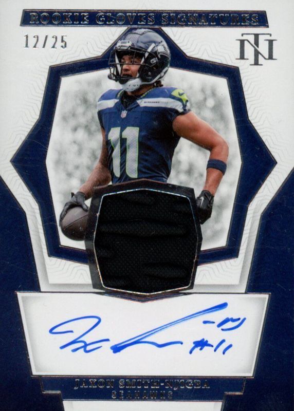 The Jaxon Smith-Njigba 2023 National Treasures #RGS-JSN Rookie Gloves Signatures /25 card in Raw condition has not changed in price in the last 30 days and was last sold for $170.50 .