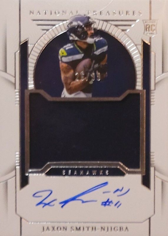 This card is 1 of 59 Jaxon Smith-Njigba's card variations in the 2023 National Treasures set being tracked by Sports Card Investor, including Rookie Material Signatures - Green Jersey Number (/11), Rookie Patch Auto - Green Jersey Number (/11), Crossover Rookie Patch Autographs /99, Rookie Material Signatures /99, and Rookie Signatures Field Pass /99.