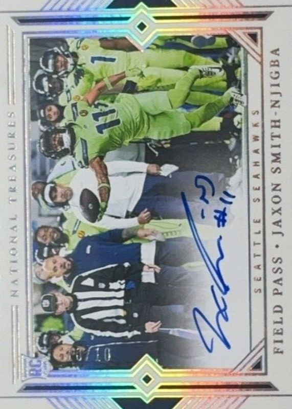 This card is 1 of 59 Jaxon Smith-Njigba's card variations in the 2023 National Treasures set being tracked by Sports Card Investor, including Rookie Material Signatures - Green Jersey Number (/11), Rookie Patch Auto - Green Jersey Number (/11), Crossover Rookie Patch Autographs /99, Rookie Material Signatures /99, and Rookie Patch Auto /99.