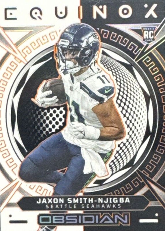 The Jaxon Smith-Njigba 2023 Obsidian #22 Equinox - Electric Etch Orange /65 Rookie card in Raw condition has not changed in price in the last 30 days and was last sold for $21.50 .