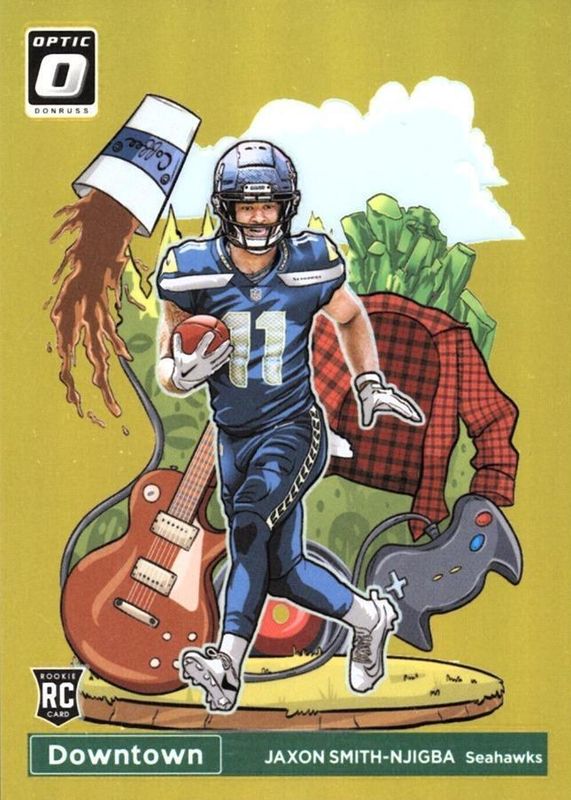 The Jaxon Smith-Njigba 2023 Optic #D-15 Downtown - Gold /10 Rookie card in Raw condition has not changed in price in the last 30 days and was last sold for $2,000.00 .