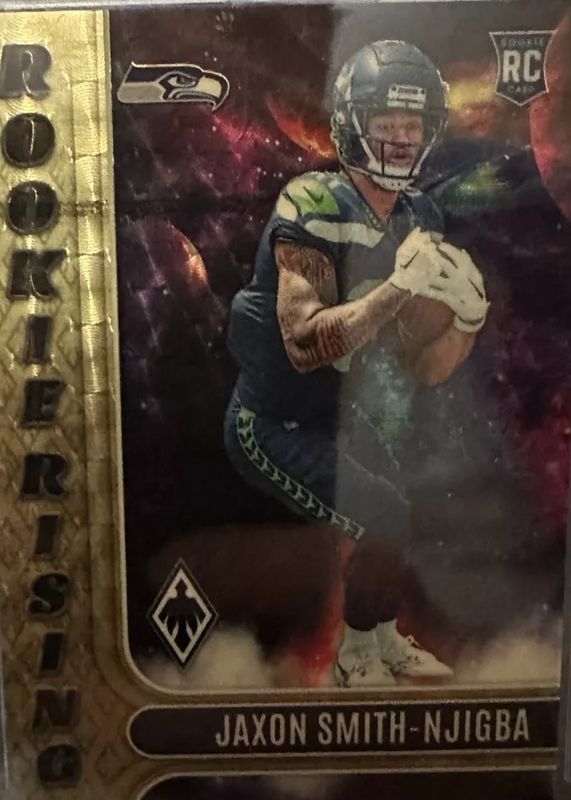 The Jaxon Smith-Njigba 2023 Phoenix #RIS-9 Rookie Rising - Gold /1 card in Raw condition has not changed in price in the last 30 days and was last sold for $177.50 .