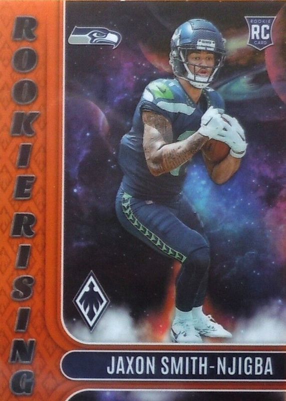 The Jaxon Smith-Njigba 2023 Phoenix #RIS-9 Rookie Rising - Orange /99 card in Raw condition has moved down -$0.51 (-4.9%) in the last 30 days and was last sold for $9.99 .