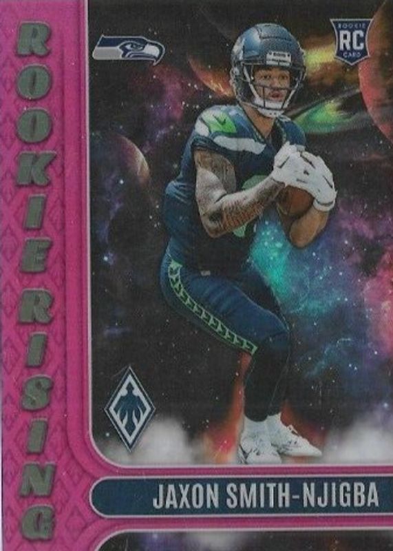 The Jaxon Smith-Njigba 2023 Phoenix #RIS-9 Rookie Rising - Pink /175 card in Raw condition has not changed in price in the last 30 days and was last sold for $9.99 .