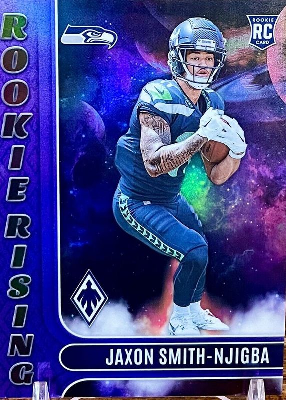 The Jaxon Smith-Njigba 2023 Phoenix #RIS-9 Rookie Rising - Purple /125 card in Raw condition has not changed in price in the last 30 days and was last sold for $12.00 .