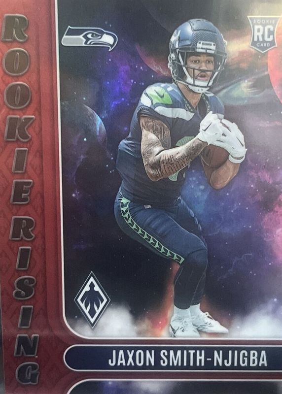 The Jaxon Smith-Njigba 2023 Phoenix #RIS-9 Rookie Rising - Red /199 card in Raw condition has moved down -$3.98 (-39.8%) in the last 30 days and was last sold for $6.01 .