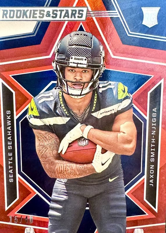 The Jaxon Smith-Njigba 2023 Rookies & Stars #151 Red & Blue /40 card in Raw condition has not changed in price in the last 30 days and was last sold for $5.39 .