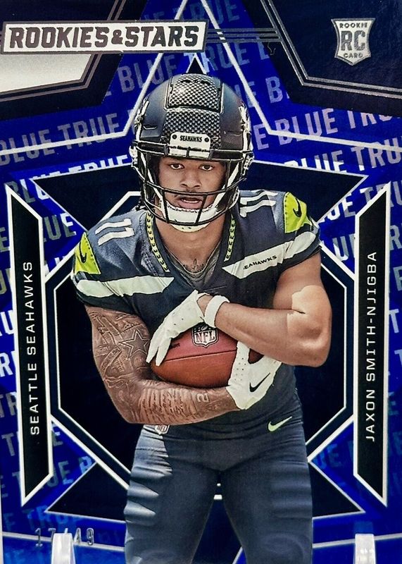 The Jaxon Smith-Njigba 2023 Rookies & Stars #151 True Blue /49 card in Raw condition has not changed in price in the last 30 days and was last sold for $11.99 .