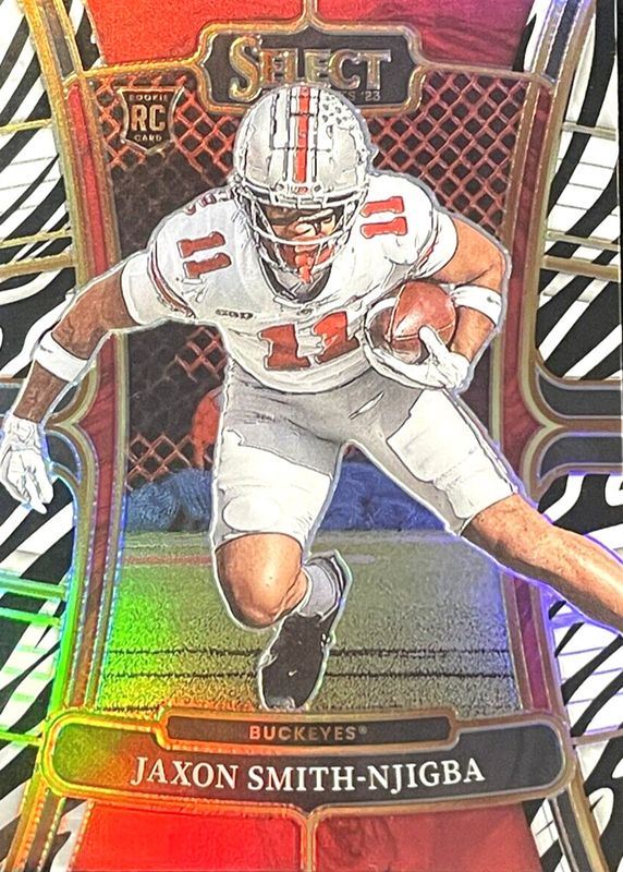 The Jaxon Smith-Njigba 2023 Select Draft Picks #7 Concourse Zebra /(SSP) Rookie card in Raw condition has not changed in price in the last 30 days and was last sold for $50.00 .