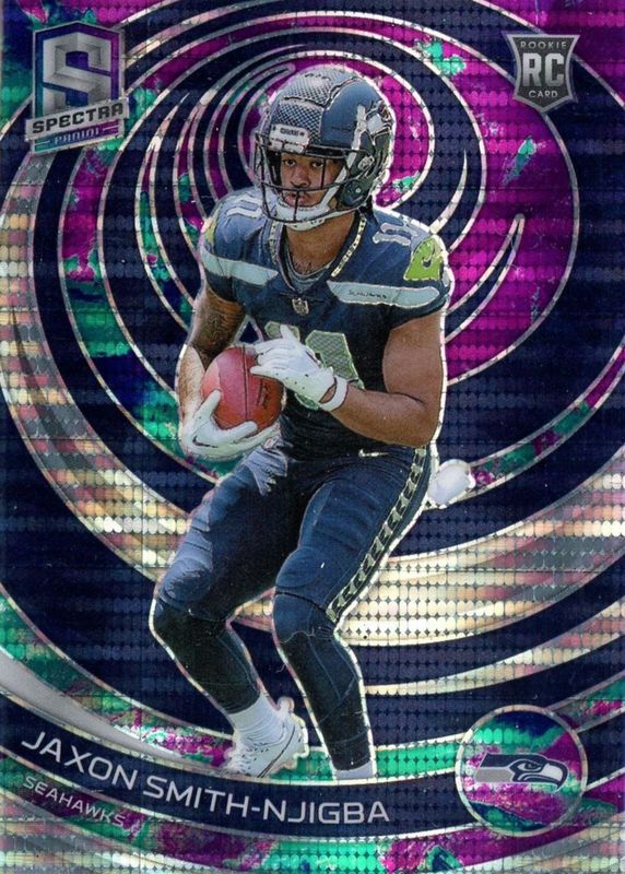 This card is 1 of 42 Jaxon Smith-Njigba's card variations in the 2023 Spectra set being tracked by Sports Card Investor, including Base, Silver, Hyper /75, Interstellar /60, and Neon Blue Die-Cut /50.