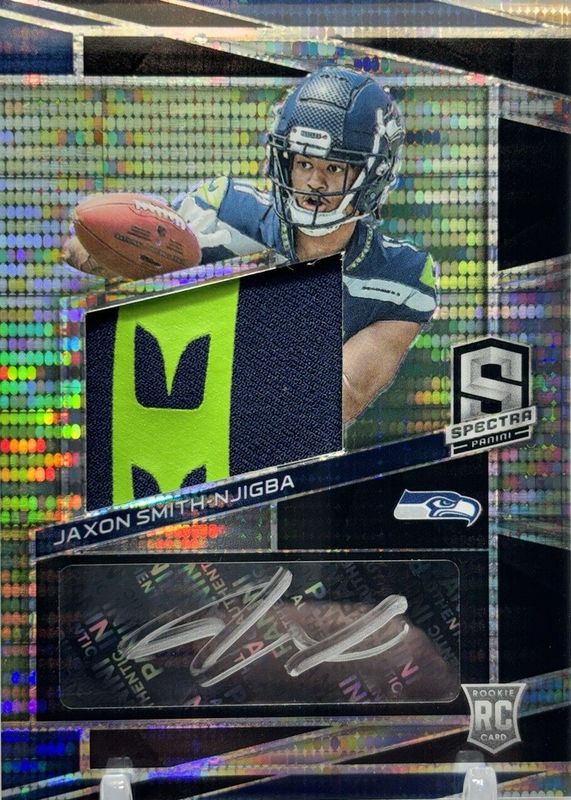 The Jaxon Smith-Njigba 2023 Spectra #217 Rookie Patch Auto - Neon Black Light /10 card in Raw condition has not changed in price in the last 30 days and was last sold for $82.01 .