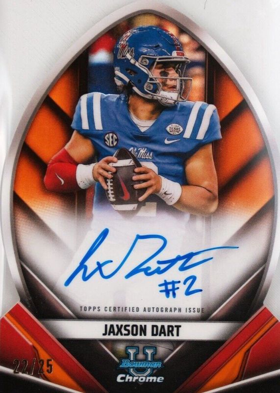 This card is 1 of 19 Jaxson Dart's card variations in the 2023 Bowman Chrome University set being tracked by Sports Card Investor, including Prospect Auto, Prospect Auto - Refractor /499, Prospect Auto - Fuchsia Mini-Diamond Refractor /150, 1955 Bowman Football Autographs /99, and Prospect Auto - Green Refractor /99.