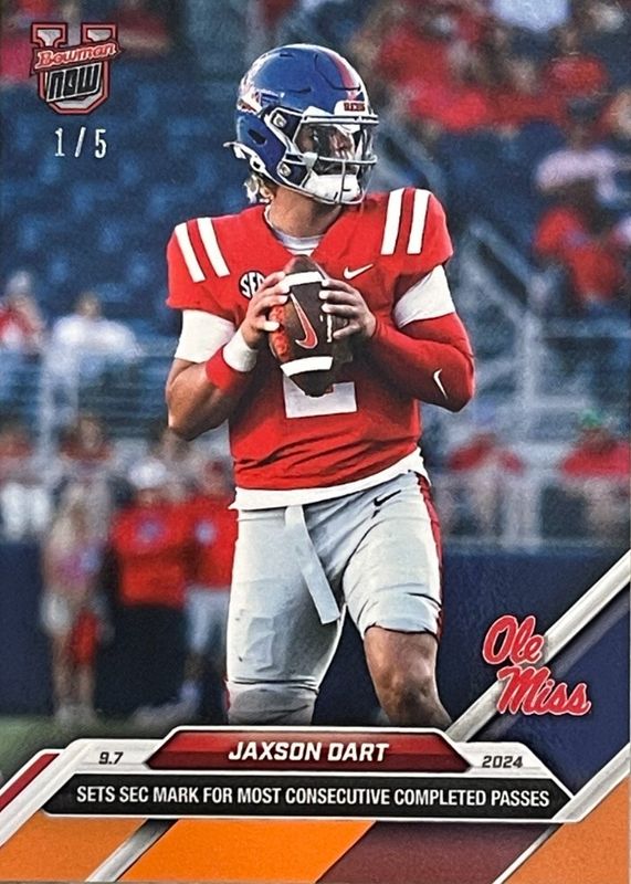 This card is 1 of 30 Jaxson Dart's card variations in the 2024 Bowman U Now set being tracked by Sports Card Investor, including Base (Print Run: 690), Base (Print Run: 985), Base (Print Run: 307), Base (Print Run: 523), and Base (Print Run: 339).