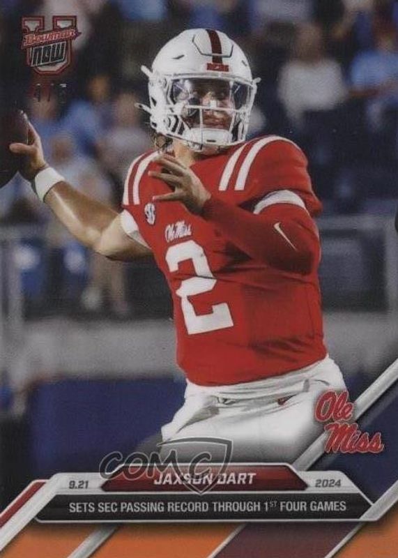 This card is 1 of 30 Jaxson Dart's card variations in the 2024 Bowman U Now set being tracked by Sports Card Investor, including Base (Print Run: 690), Base (Print Run: 985), Base (Print Run: 307), Base (Print Run: 523), and Base (Print Run: 339).