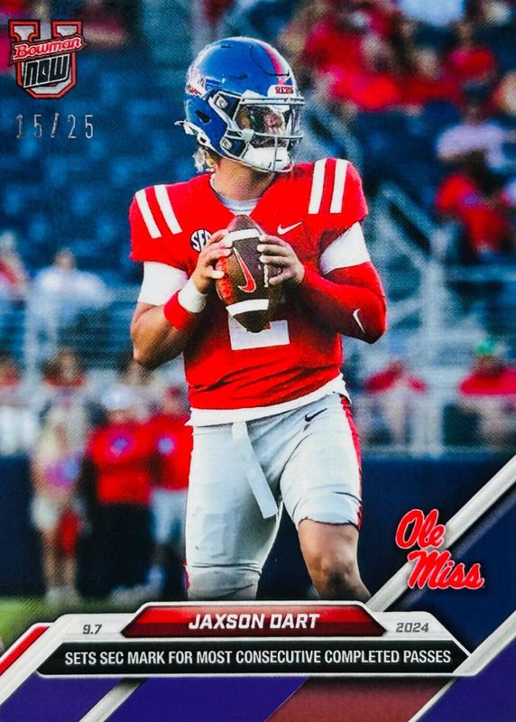 This card is 1 of 30 Jaxson Dart's card variations in the 2024 Bowman U Now set being tracked by Sports Card Investor, including Base (Print Run: 690), Base (Print Run: 985), Base (Print Run: 307), Base (Print Run: 523), and Base (Print Run: 339).