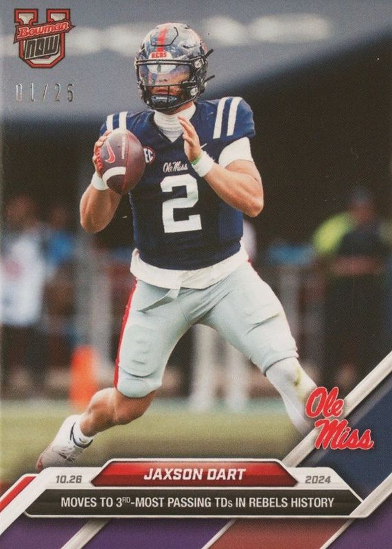 This card is 1 of 30 Jaxson Dart's card variations in the 2024 Bowman U Now set being tracked by Sports Card Investor, including Base (Print Run: 690), Base (Print Run: 985), Base (Print Run: 307), Base (Print Run: 523), and Base (Print Run: 339).