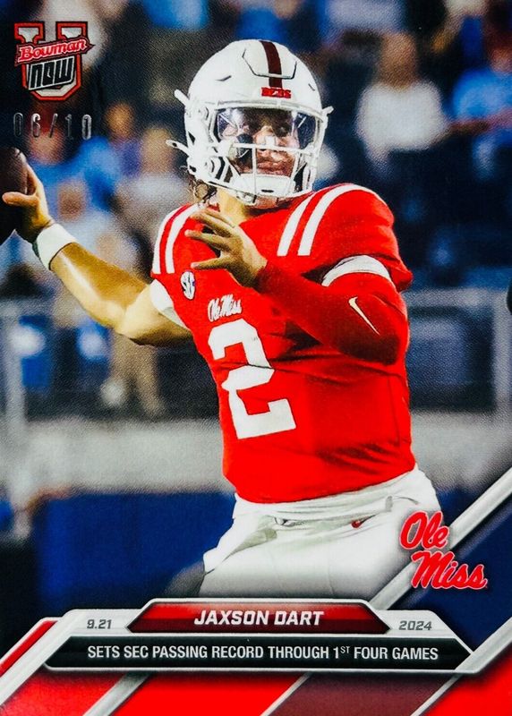 This card is 1 of 30 Jaxson Dart's card variations in the 2024 Bowman U Now set being tracked by Sports Card Investor, including Base (Print Run: 690), Base (Print Run: 985), Base (Print Run: 307), Base (Print Run: 523), and Base (Print Run: 339).