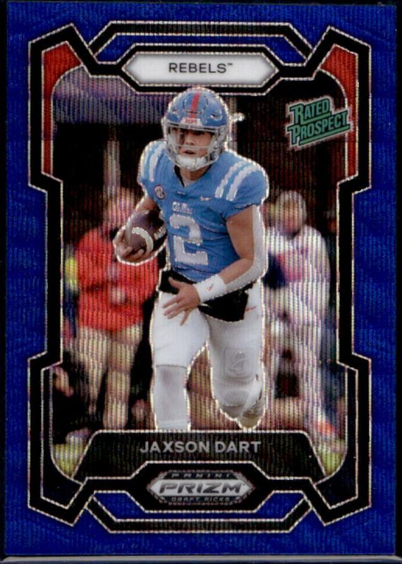 The Jaxson Dart 2024 Prizm Draft Picks #147 Blue Wave /249 card is 1 of 83 Jaxson Dart's card variations in the 2024 Prizm Draft Picks set being tracked by Sports Card Investor, including Base, Green, Purple Wave, Red Ice, and Ruby Wave.