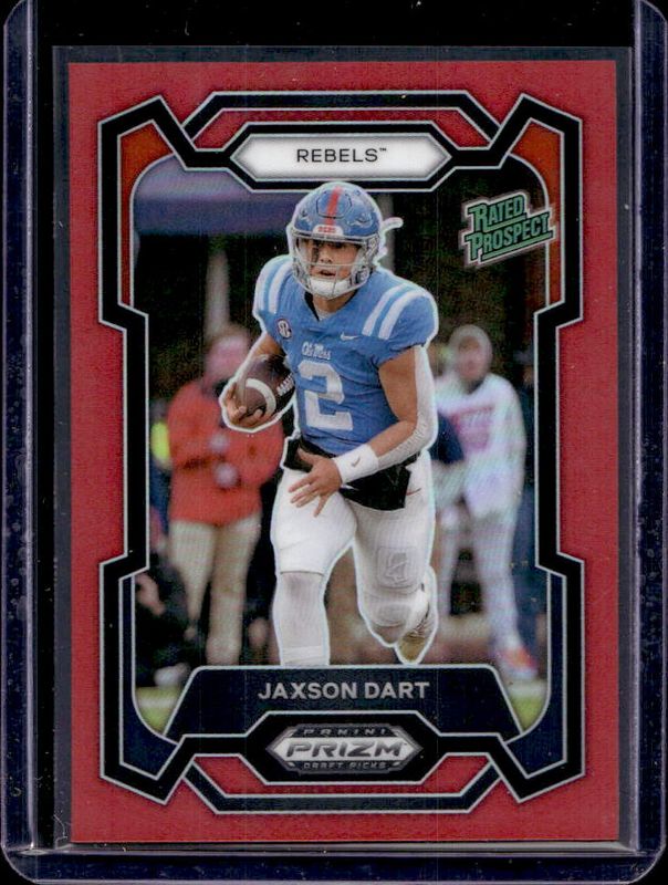The Jaxson Dart 2024 Prizm Draft Picks #147 Red /299 card is 1 of 83 Jaxson Dart's card variations in the 2024 Prizm Draft Picks set being tracked by Sports Card Investor, including Base, Green, Purple Wave, Red Ice, and Ruby Wave.