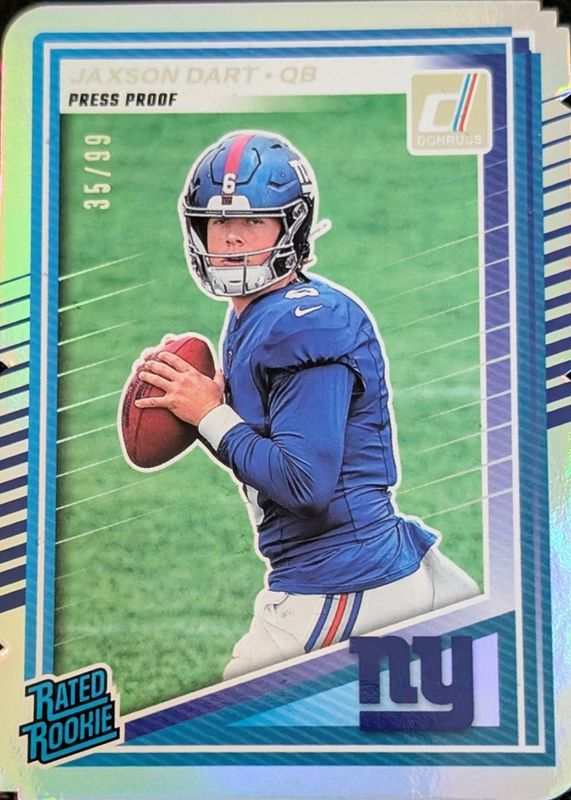 The Jaxson Dart 2025 Donruss #400 Press Proof Silver Die-Cut /99 Rookie card in Raw condition has not changed in price in the last 30 days and was last sold for $70.51 .