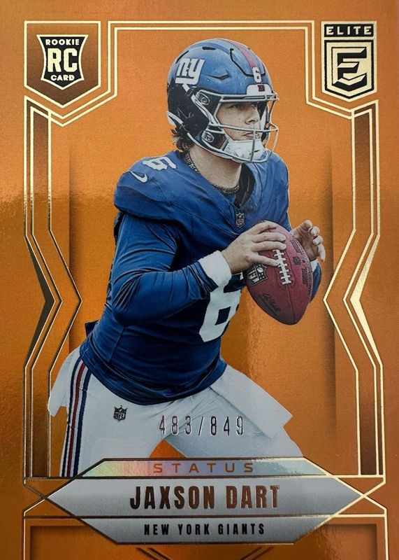 The Jaxson Dart 2025 Elite #103 Status Metallic Orange /849 Rookie card in Raw condition has moved down -$4.00 (-15.4%) in the last 30 days and was last sold for $22.00 .